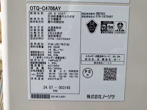 山武市 ノーリツ給湯器→ノーリツ石油給湯機付ふろがまOTQ-C4706AY 給湯器交換工事