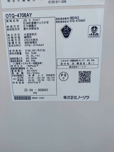 木更津市瓜倉 ノーリツ給湯器→ノーリツ石油給湯機付ふろがまOTQ-4706AY 給湯器交換工事